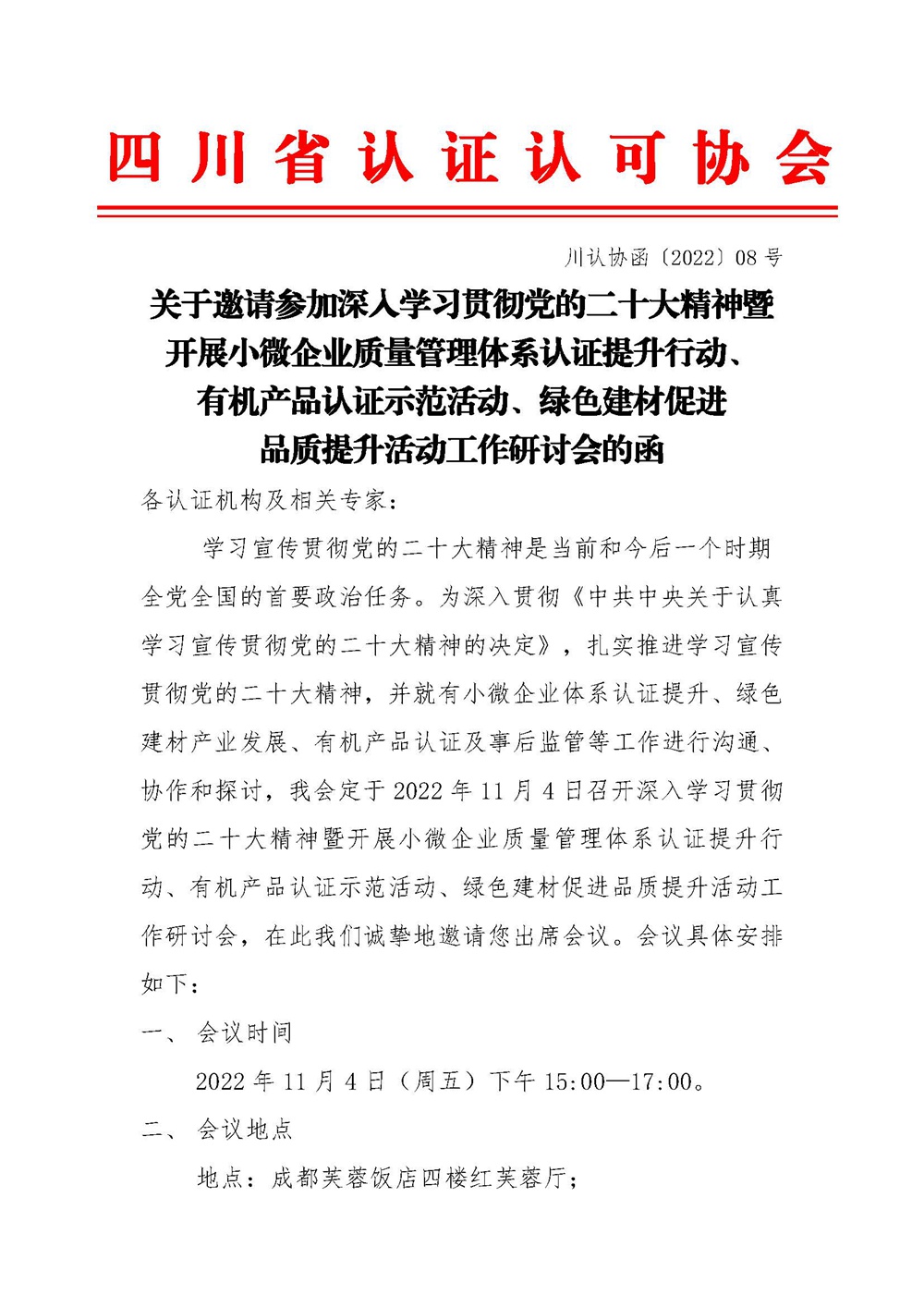 2022 年11 月4 日,四川省认证认可协会召开深入学习贯彻党的二十大精神暨开展小微企业质量管理体系认证提升行动、有机产品认证示范活动、绿色建材促进品质提升活动工作研讨会,日韩十八禁在线1区2区3区不卡-91免费精品国自产拍在线不卡-精国产品一区二区三区A片-乱CHINESE兽交PISS-国产视频一区在线受邀参加会议。