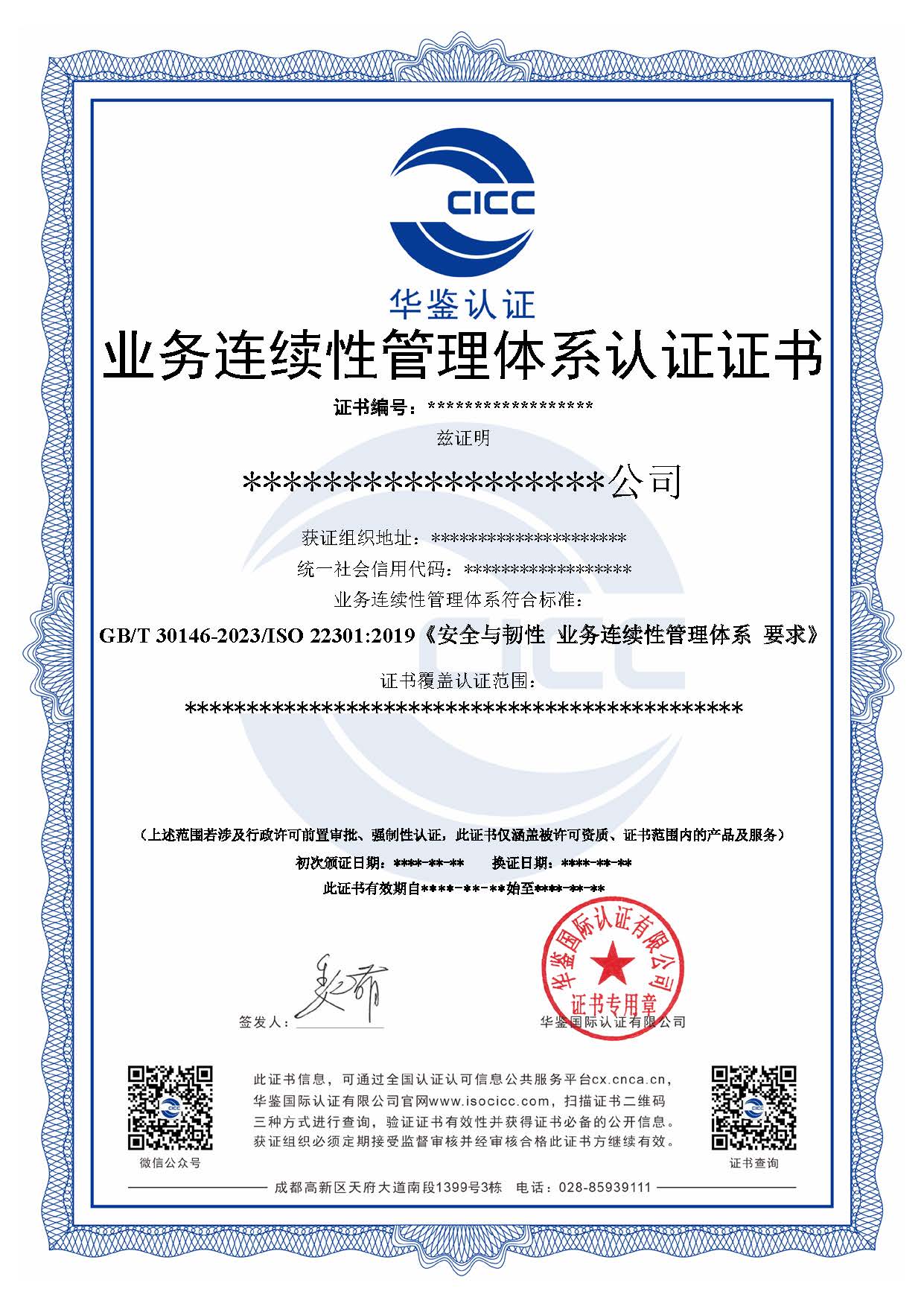 业务连续性管理体系认证证书