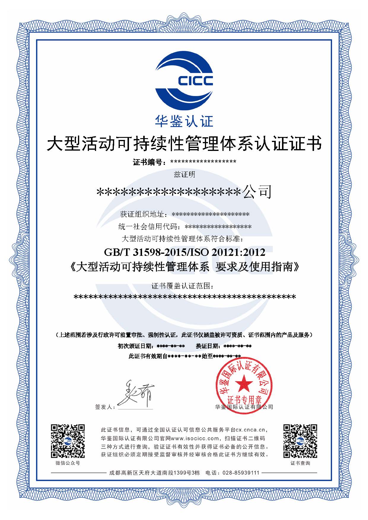 大型活动可持续性管理体系认证证书
