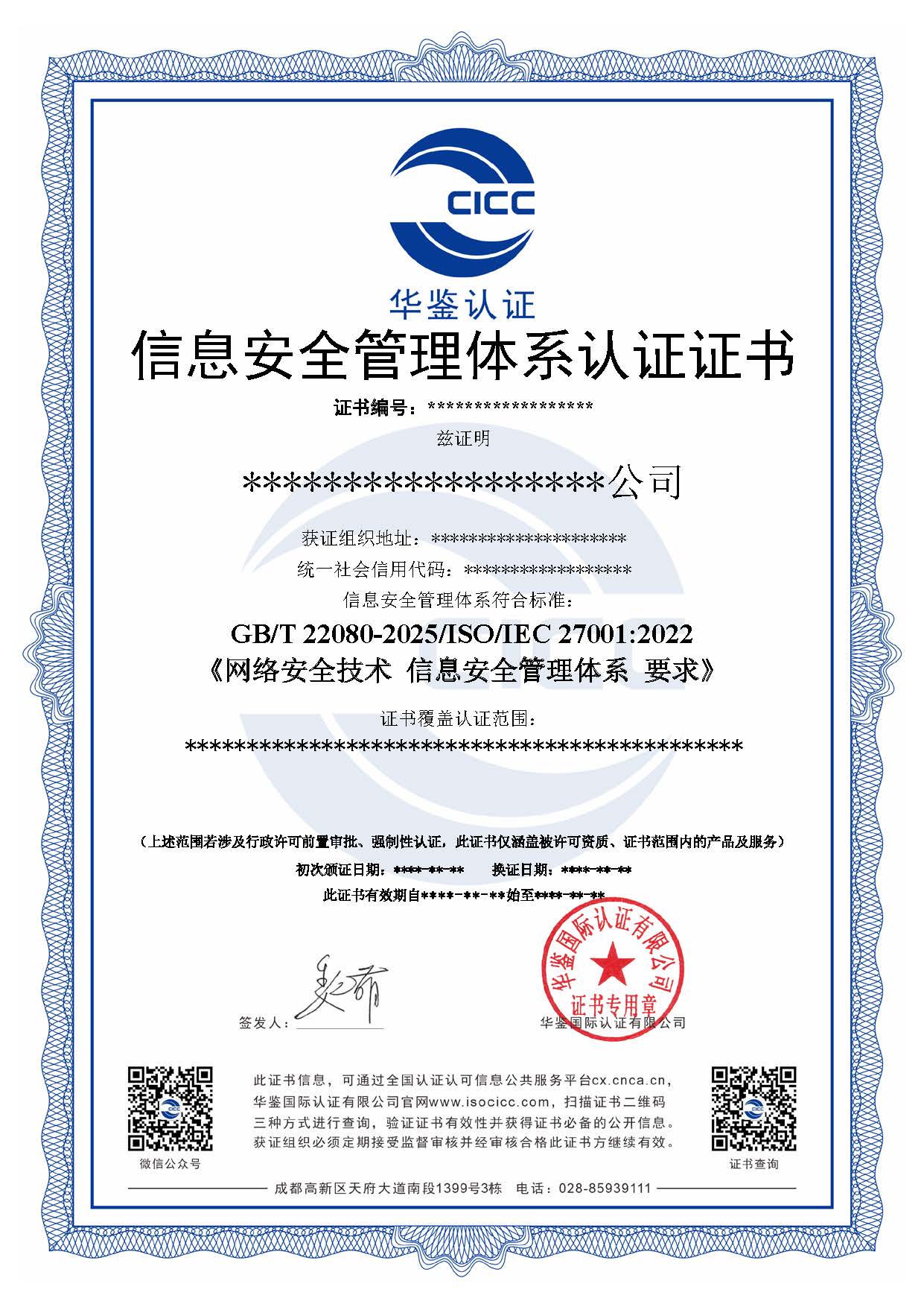 信息安全管理体系认证证书