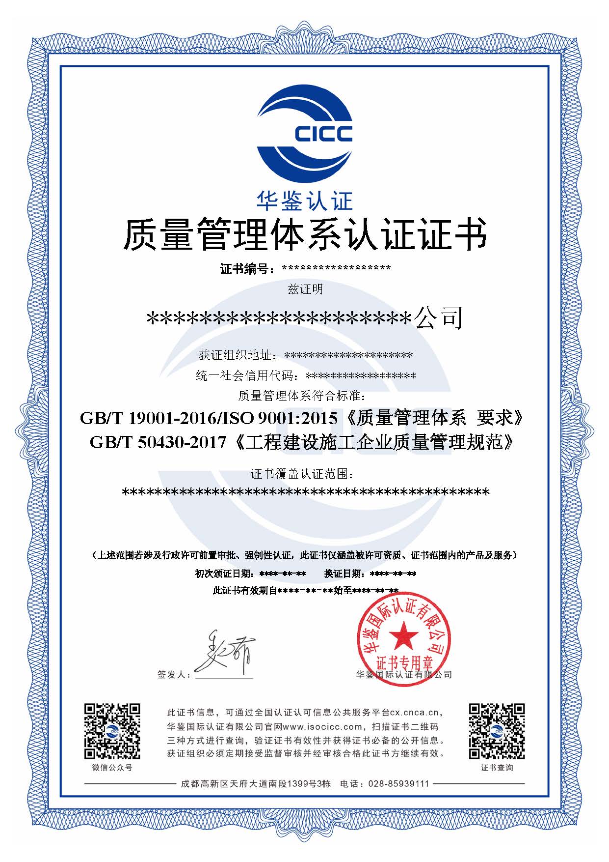GB/T50430:2017全称《工程建设施工企业质量管理规范》, 是建设部为了加强工程建设施工企业的质量管理工作,规范施工企业从工程投标、施工合同的签订、施工现场勘测、施工图纸设计、编制施工相关作业指导书、人机料进场、施工过程管理及施工过程检验、内部竣工验收、竣工交付验收、档案移交人员离场、保修服务等一系列流程而起草标准,其目的就是通过推动施工企业全面实施GB/T50430:2017。 ISO9001+GB/T50430工程建设施工企业质量管理规范,旨在加强工程建设施工企业的质量管理工作,规范施工企业质量管理行为,促进施工企业提高质量管理水平。 GB/T50430认证,是施工企业的“方向盘”,能有效加强其质量管理工作,提升管理水平,有效减少各类隐患。在招投标方面,该证书能够有效提高中标分数,提升企业竞争优势,增加中标率。