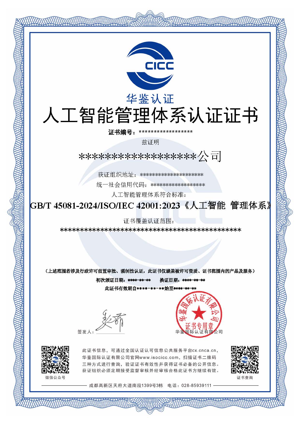 2.申请方应按照国际有效标准(GB/T 45081-2024/ISO/IEC 42001:2023)的要求在组织内建立管理体系,并实施运行至少3个月以上;